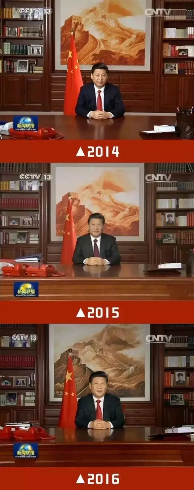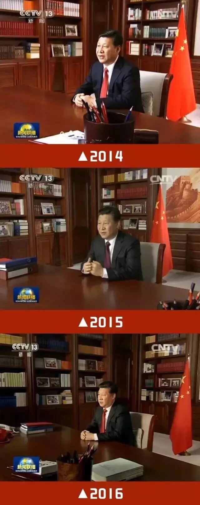 (3)书架上的照片。2014年,习主席身后的书架摆放了四张与家庭有关的生活照片。2015年,习主席身后的书架多出一张他年轻时着军装的照片,新增了慰问内蒙古边防官兵等有纪念意义的照片。注意习主席右手边的书架:2014年摆放着两张照片,其中一张是习主席踢足球的照片。在2015年致辞画面中出现的五张照片,2016年被替换成了七张新照片。