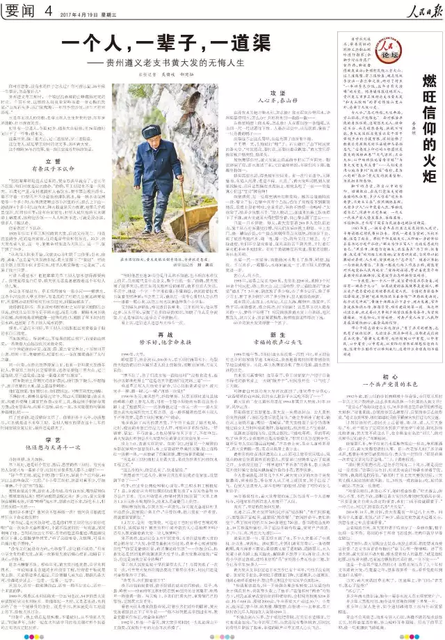 4月19日,《人民日报》第4版刊发长篇通讯《一个人,一辈子,一道渠》。 “樵夫”一文,借主人公微信昵称,巧妙喻示县委书记甘当“砍柴人”,将一生奉献给国家和人民的无私与崇高。“大爱”一文,生动形象的比喻比比皆是,“就像女儿大了不能留,好干部要赶快推荐、提拔出去”。“我看,他是一个疯子领着一群疯子在干”。通过描述性语言,写活典型人物的高情商与高智商。“渠文”则更像一篇纪实文学,从大小标题到小说式架构,再到长短段的结合,以及排比、设问、对比、反问等修辞手法的运用,在给人愉悦的审美感受之余,也启迪人进行党性与人性的深层思考。