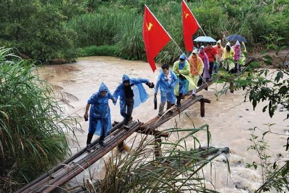 2019年6月11日至8月18日,中央宣传部组织开展了“壮丽70年·奋斗新时代——记者再走长征路”主题采访活动,先后有1300余名记者追随当年红军长征步伐,深入实地采访,累计跨越16000余公里,推出10000余篇鲜活生动、形式多样的报道,网上总阅读量近20亿次。习近平总书记近日对“记者再走长征路”主题采访活动作出重要指示强调,中央宣传部组织开展的“记者再走长征路”主题采访活动,生动再现壮怀激烈、惊天动地的革命故事,对阐释用生命和鲜血铸就的伟大长征精神很有意义。图为6月13日,参加主题采访活动的记者们,在江西于都县祁禄山沿着当年中央红军长征走过的“红军小道”冒雨行进,体验红军穿越深山峡谷的艰苦行程。经济日报记者 刘兴/摄