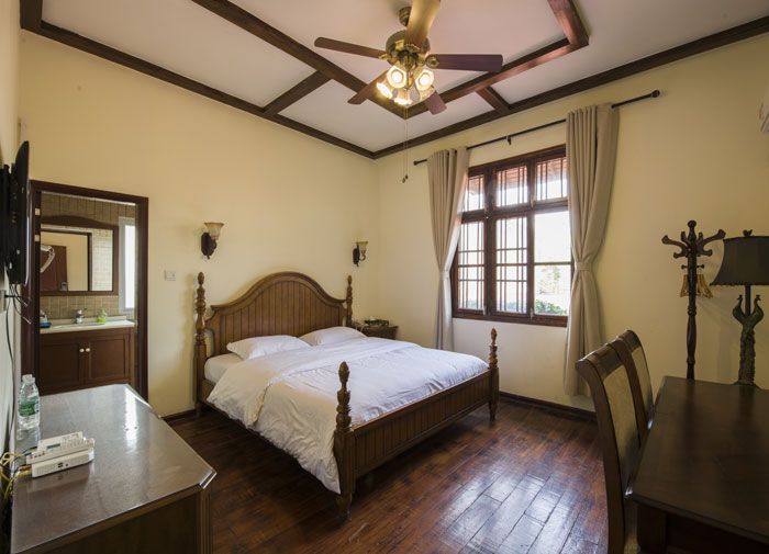 民宿的住宿区和休闲功能区若即若离,设置了开放式厨房、风味餐厅、温暖亲子房、榻榻米亲友房、情侣风情房竽多情调的功能房间。客房蓝绿相间的茑木染色调清雅,大盆绿航绿萝的点缀,幽静宁谧。在这里住下来,游客可以尝试栽种四季蔬菜和花草,亲自摘菜、烹饪,入园采摘时鲜水果。