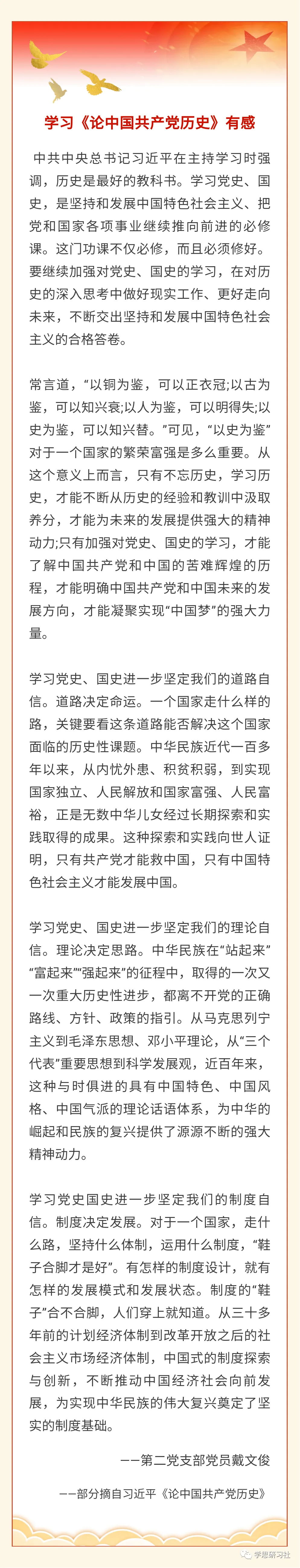 《论中国共产党历史》学习心得体会范文(3) 党的历史可以说是党领导全国各族人民为实现民族独立和人民解放,国家富强和人民幸福而不懈努力奋斗的历史;是马克思主义基本原理同中国实践相结合,不断推进马克思主义中国化,实现理论创新和飞跃的历史;是不断推进党的建设伟大工程,历经各种风险和考验,保持和发展党的先进性,不断提高领导水平和执政能力的历史。这部历史无论从什么样的高度解读,对于党和国家,对于人民大众,对于中华民族,对于人类文明都具有极其重要的价值,作为历史它既是以往道路的丰碑,又是开辟未来的起点,是中华民族重新崛起走向繁荣富强的里程碑。通过初步学习,让我感受颇多,收益匪浅。下面我就学习《论中国共产党历史》第一至三章谈几点体会: 一、坚守初心使命,实现伟大梦想 回顾党的历史,我们党在弱小中发展壮大,在困境中绝处逢生,在攻坚克难中从胜利走向胜利,根本原因就在于不管是处于顺境还是逆境,我们党始终坚守为中国人民谋幸福、为中华民族谋复兴这个初心和使命,义无反顾向着这个目标前进,从而赢得了人民衷心拥护和坚定支持。通过学习《论中国共产党历史》第一章,让我从思想到灵魂再一次接受中国共产党最先进的思想、最伟大的理想和最崇高的事业洗礼,再一次感受没有共产党就没有新中国,只有社会主义才能救中国的深刻含义,让我坚信我们的道路是正确的,我们的方向是明朗的。只要我们坚守初心,实干苦干,抓住历史机遇,锐意进取开辟新局,伟大的“中国梦”是一定能够实现的。 二、正确看待历史,凝聚前行力量 《论中国共产党历史》第二章中提到“改革开放是中国特色社会主义发展的一个历史性决策,如果没有一九四九年建立新中国并进行社会主义革命和建设,积累了重要的思想、物质、制度条件,积累了正反两方面经验,改革开放也很难顺利推进。”习总书记强调,要“在对历史的深入思考中汲取智慧、走向未来”。中国共产党百年历程一路走来,累积了大量攻坚克难的办法,蕴含着历史智慧、政治智慧、管理智慧,在治国理政、治党治军、内政外交中积累了丰富经验。通过学习,让我深刻体会到中国特色社会主义发展历程是曲折的,所以要从不同角度去看待历史,要从党史和中国特色社会主义发展史中汲取信仰、信念、信心的智慧和力量,汲取尊重人民、依靠人民的智慧和力量,汲取推进党的建设的智慧和力量。将历史智慧转化为前进力量,才能创造出让世界刮目相看的新的更大奇迹;把党的历史上形成的大智慧传承下去,才能战胜前进道路上的各种艰难险阻,使“中国号”这艘巨轮继续破浪前进、行稳致远。 三、把握学习重点,提高能力素质 《论中国共产党历史》第三章,描述的是习近平总书记在不同时期不同场合对开展党史教育作的重要论述。春节前夕习近平总书记赴贵州看望慰问各族干部群众时也强调,“要深入学习党的创新理论,加强党史学习教育,同时学习新中国史、改革开放史、社会主义发展史,不断提高政治判断力、政治领悟力、政治执行力”。更是深刻阐述了开展党史学习教育的重大意义,系统回答了为什么学、学什么、如何学等重要问题,为开展好党史学习教育指明了方向,提供了根本遵循。所以学好党史,有利于不断增强业务学习本领、政治领导本领、改革创新本领、科学发展本领、依法执政本领、群众工作本领、狠抓落实本领、驾驭风险本领,更加自觉地为实现中华民族伟大复兴的中国梦而不懈奋斗;学好党史,能够进一步提升素质,涵养能力,提高我们运用辩证唯物主义和历史唯物主义的观点立场分析问题、解决问题的水平,从而更好地掌握真实情况,把握客观规律,发扬艰苦奋斗、埋头苦干的工作作风,踏踏实实把党的基本理论、基本路线、基本纲领、基本经验、基本要求贯彻落实好;学好党史,可以从中汲取智慧、增添力量、坚定信念、提升能力,知史爱党、知史爱国,知史爱岗。
