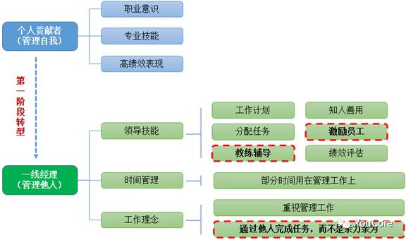 【步骤二 构建框架】 虽然知道要构建管理者的能力模型了,但能力模型应该是啥样的,两眼一抹黑呀。 不急!“不要重新发明车轮”,既然别人都开发出那么多优秀的框架了,我们直接套一个呗,就用拉姆·查兰的领导梯队模型吧。 图、拉姆·查兰的领导梯队模型 根据以上模型,老曹目前处于第一阶段转型,他若想往上再升一级就必须先成功完成第一阶段转型,领导梯队定位明确后我们就可以用拉姆·查兰给出的第一阶段管理者的能力框架给老曹把把脉了。 图、一线经理的能力框架(绿色部分) 有了能力模型,老曹就十分清晰地知道作为开发主管需要具备哪些能力,也能清晰地认识到自己各个能力维度的差距了。